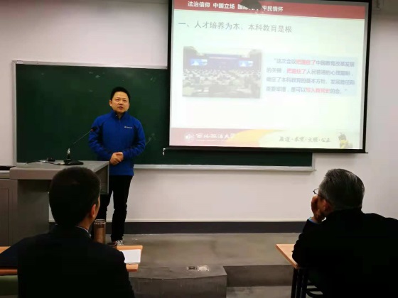 以德立身,以德立学。为了贯彻落实教育部关于师德师风建设的相关要求,深入领会教育部关于“新时代高教四十条”的精神内涵,2018年11月12日晚,awc777万象城娱乐官网在雁塔校区三号教学楼3604教室举行师德师风建设宣讲会,我校 “全国优秀教师”荣誉称号获得者汪世荣教授以“师德师风建设”为主题做了专题报告,教务处处长陈京春教授对“高教四十条”进行了要点介绍和深入解读。awc777万象城娱乐官网党政班子成员和全体教职工参加了大会,宣讲会由学院党委书记毕成主持。
