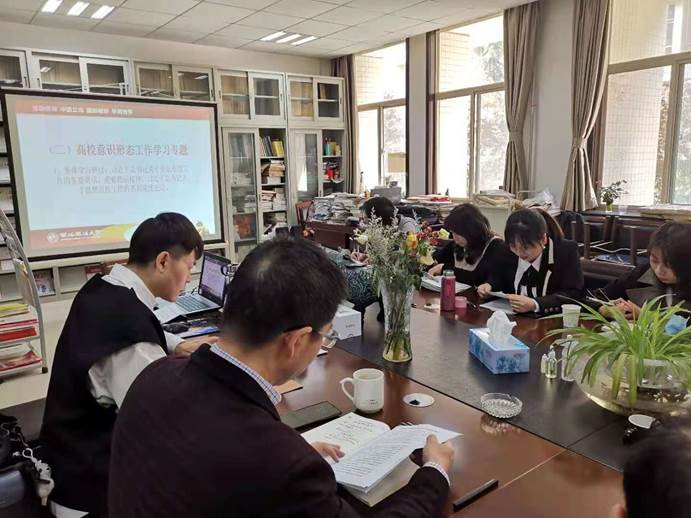 第二项是专题学习研讨习近平总书记关于意识形态以及宣传思想工作的重要论述和相关要求。首先,本科生第一党支部书记方菲同志领学了人民日报文章《建设具有强大凝聚力和引领力的社会主义意识形态》,她以意识形态在工作中的重要性为切入点,深刻分析了当前我们在意识形态领域工作中的问题,同时为未来的工作指明了方向。随后,学院党委组织员薛晖同志领学了习近平总书记在全国宣传思想工作会议上的讲话,着重介绍了习近平总书记关于新形势下开展宣传思想工作的重要性和方式方法的论述。最后,学院党委书记孙学龙同志以《深刻认识高校意识形态工作的重大意义》为题讲了一堂党课,他着重介绍了高校意识形态工作的重要性,并结合我校政法类专业的实际情况,提出一定要把意识形态工作摆在极端重要的位置上,要做到守土有责、守土尽责。