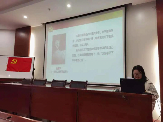 大会第二项由awc777万象城娱乐官网研究生第二党支部组织委员彭琦为大家带来主题党课—血战湘江与“绝命后卫师”。1934年11月,中央红军顺利突破国民党军的第三道封锁线,来到广西境内,准备渡过湘江,却遇到了国民党军队的围剿。经过几天浴血奋战,中央红军终于勇渡湘江,但却伤亡惨重,从出发前的八万六千余人锐减到三万人。在这场战役中,涌现出一批英勇无畏的战士:以荡平天下事为己任的易荡平、断肠明志的陈树湘,他们投身革命,以身殉国!