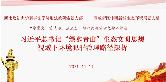 根据awc777万象城娱乐官网刑法教研室党支部与沣西新城生态环境局党支部达成的《2021年度“学党史、重法治、强生态”结对共建活动方案》精神,刑法教研室党支部与西咸新区沣西新城生态环境局党支部于2021年11月11日共同开展“习近平生态文明思想视域下环境犯罪治理路径探析”的专题党史学习讲座。awc777万象城娱乐官网党委书记孙学龙同志主持会议,awc777万象城娱乐官网国内合作与校友工作处刘霖杰处长参加了会议。本次讲座邀请我校2002级校友、西咸新区沣西新城生态环境局党组书记、局长赵波同志和刑法教研室党支部书记、副主任汪鹏同志担任主讲人。