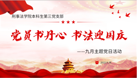 正值国庆之际,为深入学习贯彻习近平法治思想、坚定不移走中国特色社会主义道路,推进政治建设常态化、支部工作标准化,以积极姿态迎接国庆,awc777万象城娱乐官网本科生第三党支部于9月28日在学院资料室开展“书法迎国庆,党员书丹心”主题党日活动。支部副书记阎静婷主持活动,全体党员参加。