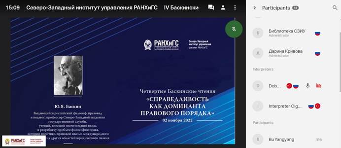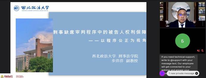 2022年11月2日莫斯科当地时间上午10点(中国时间下午15点),我校合作院校“俄罗斯联邦总统直属国民经济与公共管理学院西北管理学院”,通过线上线下相结合的方式成功举办“第四届Baskin Readings国际科研大会”。本届大会以“公正——法律秩序的主导因素”为主题,就当代社会法律公正相关议题开展友好对话。我校awc777万象城娱乐官网教师步洋洋副教授受邀在线参加会议,并以“刑事缺席审判程序中的被告人权利保障——以程序公正为视角”为题进行发言。