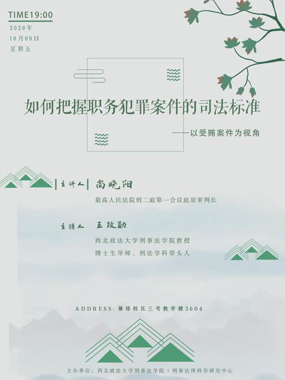 2020年10月9日,awc777万象城娱乐官网刑法学科本学年的第一场线下实务讲座活动在awc777万象城娱乐官网雁塔校区三号教学楼3604教室举行。本次讲座由awc777万象城娱乐官网、刑事法律科学研究中心主办,由最高人民法院刑二庭第一合议庭原审判长尚晓阳法官担任主讲人。陕西省高级人民法院刑二庭王海峰法官、awc777万象城娱乐官网刑法专业硕士生导师组组长杜发全教授、刑法教研室主任张国伟副教授、刑法教研室杨磊副教授、谭堃副教授、赵姗姗博士、刑事诉讼法学教研室罗长征老师刑法学专业研究生参与了本次讲座。