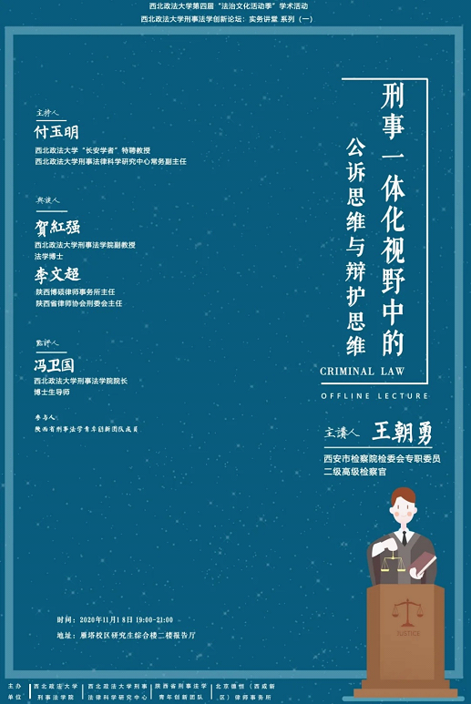 2020年11月18日晚,由awc777万象城娱乐官网、awc777万象城娱乐官网刑事法律科学研究中心、陕西省刑事法学青年创新团队以及北京德恒(西咸新区)律师事务所联合主办的刑事法学创新论坛“实务讲堂系列”讲座在雁塔校区研究生综合楼二楼报告厅举办,讲座主题为“刑事一体化视野中的公诉思维与辩护思维”。