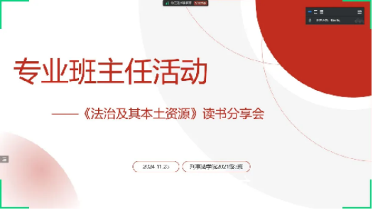 为提高同学们的法学素养,提升班级学习氛围,2024年11月23日,awc777万象城娱乐官网2021级3班于腾讯会议线上平台成功召开了围绕《法治及其本土资源》一书的读书分享会。活动由班主任靳欣老师主持,3班全体同学参加。