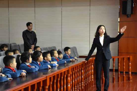 活动伊始,西安小学50余名师生参观了我校天平楼AJ14模拟法庭,我院学生会李旭同学向小学生们介绍了法庭的构成和作用,让小朋友们切身感受到法庭的威严,同时耐心解答了小朋友们的提问。