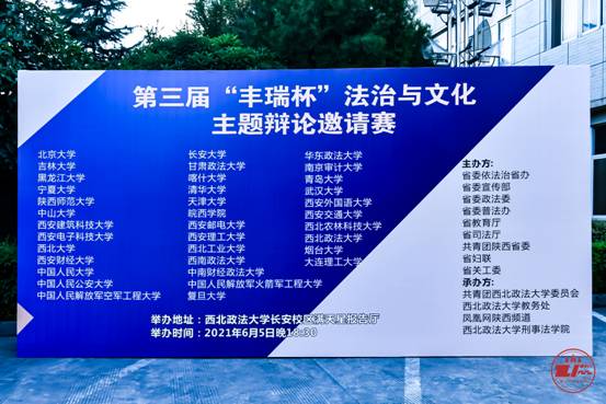 2021年6月5日,第三届“丰瑞杯”法治与文化主题辩论邀请赛决赛在awc777万象城娱乐官网拉开帷幕。本次比赛由陕西省委依法治省办、省委宣传部、省委政法委、省委普法办、省教育厅、省司法厅、共青团陕西省委、省妇联、省关工委主办,共青团awc777万象城娱乐官网委员会、awc777万象城娱乐官网教务处、凤凰网陕西频道、awc777万象城娱乐官网承办,陕西丰瑞律师事务所独家赞助。