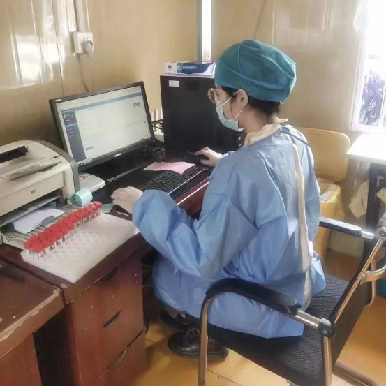 谈及志愿工作的经历,张璐说:“我很早就来到核酸点跟妈妈学习如何操作登记系统、如何正确采集核酸以及不同人员的核酸流程、消毒、配合等等。在这个说大不大说小不小的中心镇只有两个核酸检测点,我和另外几个大学生志愿者坚守在镇医院的岗位上,这段时期是回家和出去打工的高峰期,做核酸的人数惊人的多,刚开始几天总有些手忙脚乱,母亲总会笑着安慰我:只要你面带笑容没有人会为难你。每天七八点我都会到核酸检测点穿好防护服、打开电脑系统,拿出昨天闲暇时贴好标签的采集管,然后颇具仪式感地打开隔离窗,开始今天忙碌的工作,偶有闲暇便给采集管贴标签或者学习。妈妈也会时不时偷拍我,发朋友圈并配文‘小时候的跟屁虫长大啦。’弄得我哭笑不得。”