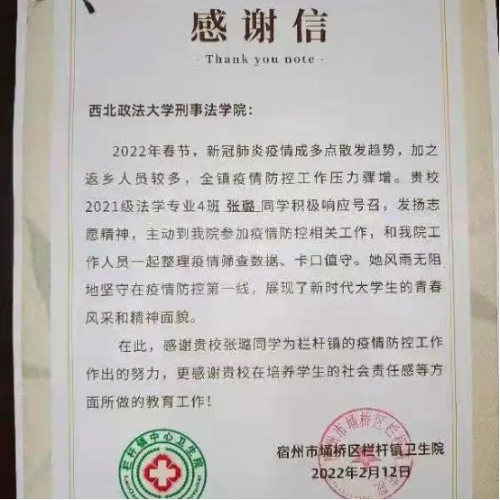 我院2021级张璐同学在家人的影响下,积极报名参加了当地疫情防控志愿服务,她于2月7日至3月10日以及开学至今的每个周末,在安徽宿州的城区和栏杆镇进行了为期33天的防疫志愿服务。