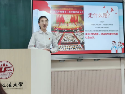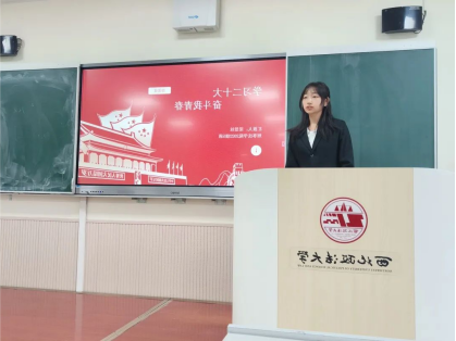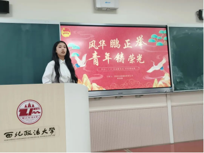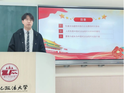 2021级徐浩同学以《争当中国式法治现代化践行者》为主题讲授团课。他从三个方面进行了具体阐述,注重与实际相结合,联系我校师生在国家法治建设过程中的具体事例阐述了法治精神,向西法大学子发出以我所长服务社会的号召。