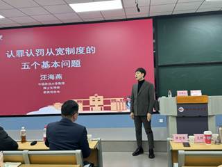 汪海燕老师从五个方面系统讲述了我国认罪认罚从宽制度的基本问题。以美国的辩诉交易制度和当事人主义诉讼模式为切入点,汪老师从认罪认罚从宽制度的价值维度出发,带领我们梳理了认罪认罚从宽制度的内涵与外延,厘清认罪认罚从宽的性质,并探讨了认罪认罚从宽与当前刑事诉讼领域的两个热点话题——“以审判为中心”和“庭审实质化”之间的关系。汪老师娓娓道来、深入浅出的讲解使得在场学生获益匪浅。