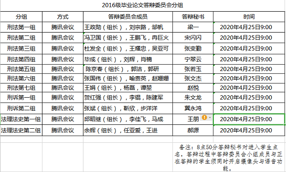 前期,学院教务办为保证线上答辩的顺利进行,针对答辩学生进行分组建群,并在答辩前一天测试每位同学的语音设备及网速。制定答辩工作方案与应急预案,组织答辩参与人员调试设备。对答辩秘书进行培训。此次线上答辩共分11组进行。其中刑法学科方向7组;刑诉学科方向2组;法史、法理学科方向2组。