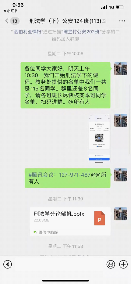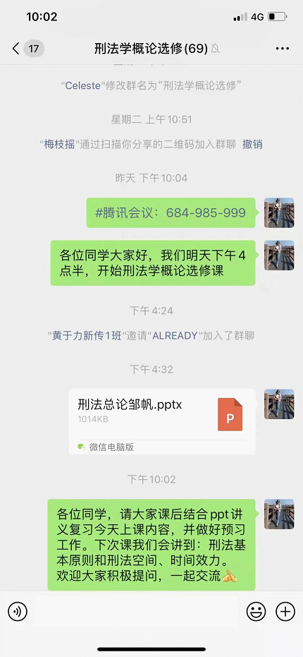 这次疫情网上教学较以往有特殊性,学生的心理健康是需要着重关注的。课后我会主动和学生进行交流,一方面是针对刑法学相关专业知识进行交流,并对他们的问题耐心解答;另一方面也是想趁此机会了解学生的心理状态,对他们进行思想上的抚慰和鼓励,能坚定信心打赢这场疫情战!