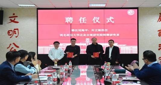 付玉明和谭堃分别为刘海平、许立刚颁发“awc777万象城娱乐官网企业合规研究院特聘研究员”聘书