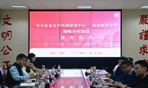 12月28日下午,我校与中小企业合作发展促进中心在长安校区举办战略合作协议签约仪式。我校校长范九利,中小企业合作发展促进中心副秘书长兼任研究发展部主任汪磊,副主任郭栋,包头企业合规研究院院长刘海平,执行院长许立刚,顾问奥琦等出席。我校副校长张荣刚主持。